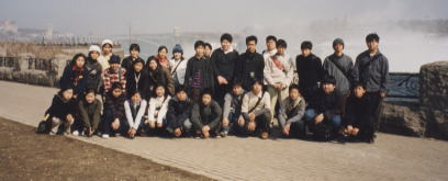 大きな変革だっただけに、中・高部長による実地踏査(平成七年三月)をしてから実施を決定するまで、アンケート調査等を含め二年の歳月が必要でした。そして昨年三月に、最初のカナダへの修学旅行が実施されたのです。 “一歩先を進む”を標榜する本校としては、海外旅行という形の上での新しさは勿論のこと、質的にも実のあるものでなくてはなりません。そのねらう所は次の通りでした。 一、六年間の一貫教育を生かす 長い六年間に節目をつけ、中学三年間の学習の目標にするとともにその成果を活かせる場とする。また更なる努力への原動力を生む。 二、国際化、情報化の本質を知る。 世界的な視野に立ってはじめてわが国日本が見えてくる。英語教育の成果を活かし、国際感覚を身につけ世界を知る。 三、学ぶものがあり安全性が高いカナダで研修する。 多民族国家であるカナダは他を受け入れるやさしさをもち、環境教育の徹底している様は、今後の社会を支える生徒たちに与えるものが大きい。 以上の理由から、三月という時期にもかかわらずカナダへの修学旅行に踏み切った次第です。今後益々素晴らしい修学旅行へと定着させていって欲しいと願っています。 ![]() 中3のカナダ修学旅行。ナイアガラの滝で(平成12年3月) | ||